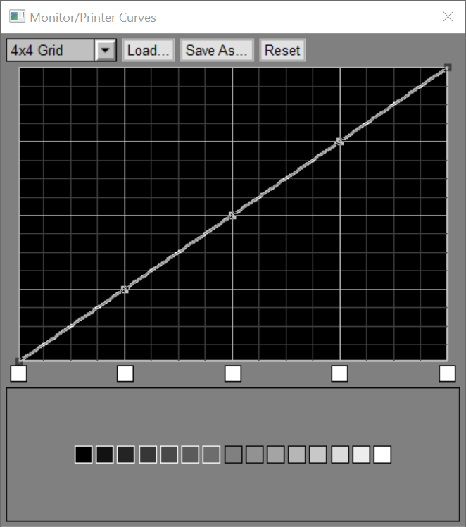 Next, select Monitor/Printer Curves... from the File menu. Adjust the brightness curve first by dragging the middle control points to get a good tonal match between the gray wedge image as displayed on your monitor and the print of the same image viewed under the same lighting you expect it to be view under, especially as regards to the ability to distinguish adjacent dark and light patches. If you find you need more curve points, select a finer grid using the grid control in the upper left corner of the dialog box. Once you have a good tonal match, click on any of the white squares below the curve to select color casts for the corresponding parts of the tonal range. This splits the curve into three curves - one for each RGB channel. Finally, click Save As... to save your monitor and printer curves for future use as you may need different curves for different viewing conditions.